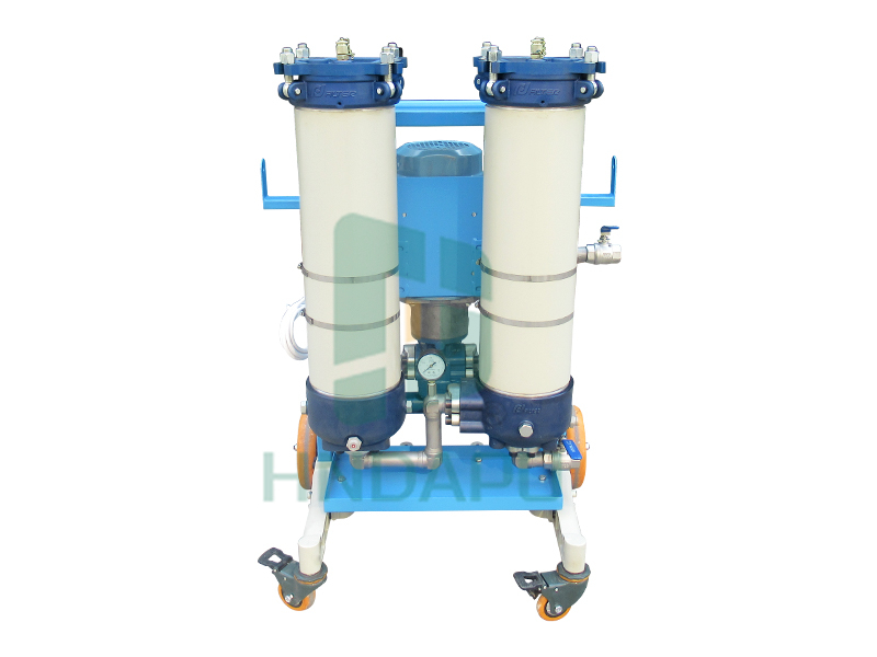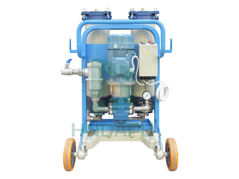 油液在注入系統(tǒng)前必須經(jīng)過凈化,未經(jīng)凈化的新油其污染度往往超過實際液壓系統(tǒng)油液規(guī)定的要求。即使是剛從油罐中抽取的新油也不適合直接使用,造成新油污染的原因是多方面的,各種污染物,包括顆粒、水分都有可能在加工、混合和儲存過程中混入新油中。移動式濾油機(jī)是一種預(yù)過濾并為系統(tǒng)注油及凈化系統(tǒng)油液的理想方法。油液中的游離水分可通過出口過濾器中安裝的脫水濾芯除去。脫水濾芯是由與水有很高結(jié)合力的高吸水樹脂制成。游離水一旦接觸此材料即被吸附。